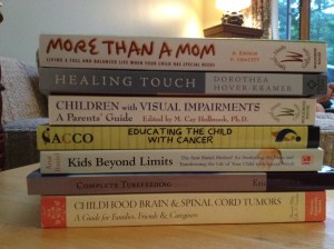 Another thing I have spent a lot of money on this year is books to help me better help Kai. I do a lot of research regarding Kai’s chemo, vision, and development and while we have tons of wonderful help with all of Kai’s therapists and practitioners, it is also nice for me to have some references and resources to read when I am looking for more. I know many parents how don’t like to know too much, in fact I think Mark probably feels that ways about a lot of things, but I am the opposite. I like to know the options. It is somehow comforting to read the research. This is nothing new for me. My personal library, pre-brain tumor, was full of informational/instructional books on breastfeeding, lactation, pregnancy, childbirth, anatomy, nutrition, herbal medicine, etc. and this collection started way before I was even thinking of having a baby myself. It could take me a year to read a novel, but give me an informational how too text and I can’t put it down. Here are some of the more recent books I have picked up along the way. Interesting stuff!